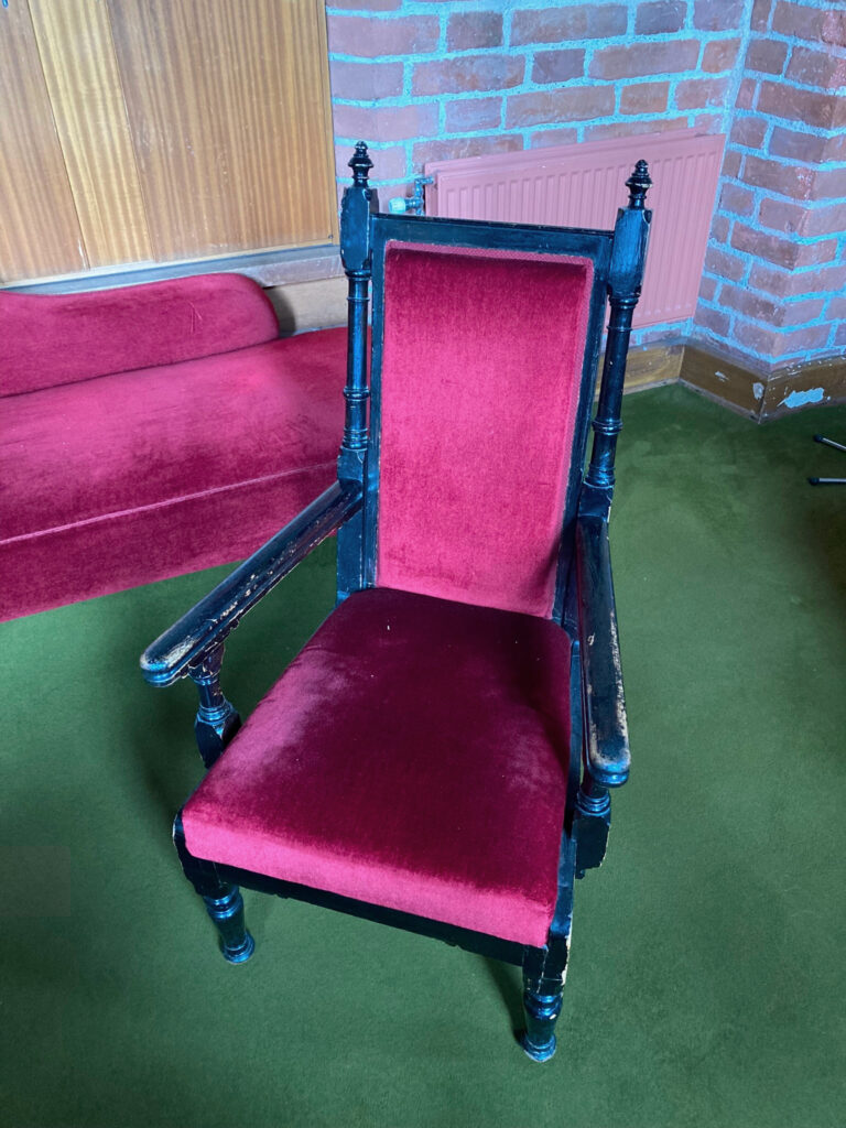 En stol til besvær. Det finnes to slike stoler i kirken. Dette bildet er fra sakristiet.